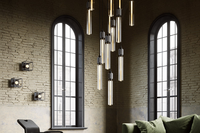 {gallery blog-gallery-4jx8kpsm}Industrial yet contemporary in design, the Caged Ceiling 5.0 Lamp is guaranteed to make a statement in any interior. A ceiling light made from a matte black metal cage, with a polished marble back panel, it features 5 of Buster + Punch's stunning Tube LED bulbs which are fixed into place with a matte black knurled lamp holder and the brand's signature penny buttons. Perfect for placing over dining tables, kitchen islands and bars, the Caged Ceiling 5.0 Lamp is an outstanding, eye-catching design that can light up any residential or hospitality setting.
