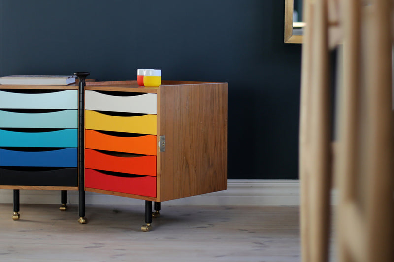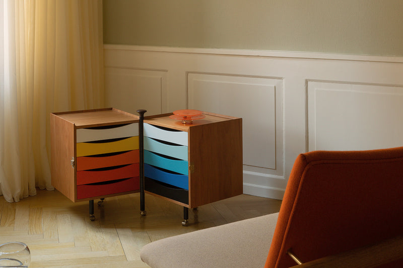 Designed by Finn Juhl for his wife, Hanne Wilhelm Hansen, the Glove Cabinet broke with design tradition when presented at the 1961 Cabinetmaker’s Guild Exhibition in Copenhagen. A dynamic reinvention of the traditional chest of drawers, this jewelry box-inspired design features Japanese cherry wood, brass detailing and a daring, colourful interior. An elegant yet playful storage space for the home, the Glove Cabinet is an extraordinary tribute to both the past, present and future.Explore the Glove Cabinet >