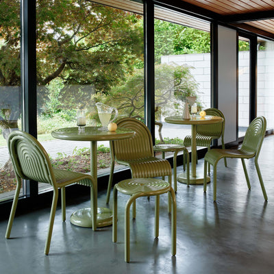 Made from premium aluminium, the set is weatherproof and corrosion resistant, making it an excellent choice for durable garden furniture. The unique grooved design is reminiscent of art deco curves, made contemporary by the glossy powder coating. Available in two sophisticated shades, moss and putty.