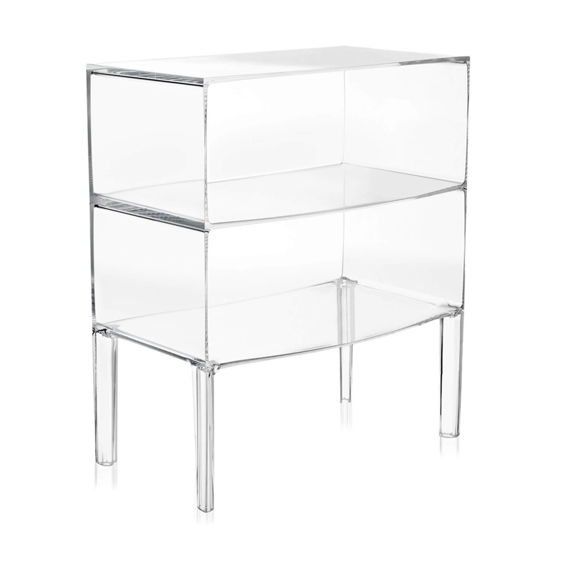 Made in Europe with meticulous attention to detail, the Ghost Buster Shelf Unit combines transparency and plastic to create a captivating and functional design. With its open fronted shelves and slender bifacial legs, the Ghost Buster Shelf Unit embodies the perfect balance between form and function. It gracefully captures the essence of classic furniture while infusing it with a contemporary twist. The combination of corners and curves, straight and sinuous lines, creates a visually captivating piece that plays with perspectives and reflections, adding a touch of artistic elegance to any space.