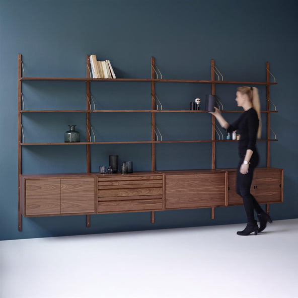 The Royal System® is an iconic Danish shelving solution that blends both design with unparalleled functionality. Available in three wood finishes, the system features wall-mounted rails, brass or stainless steel shelf hangers, and cabinets. These are thoughtfully designed, pre-configured configurations, suitable for all environments.