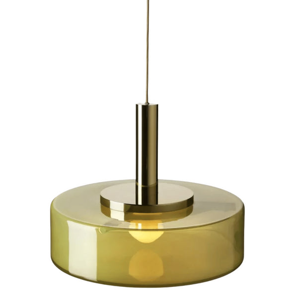 Named after the series of successful Czechoslovak science satellites that orbited the Earth in the 1960s as part of the Interkosmos program, this lighting fixture features a large flat cylinder of blown glass in green. The massive piece of tinted opal glass is attached to a minimalist three-pronged metal structure inside the glass, resembling a small space station.