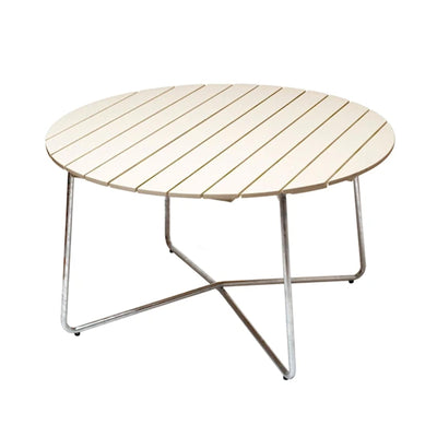 Table 9A by Grythyttan Stalmobler has a removable and collapsible base and comes in two diameters; 100cm and 120cm. The design features a durable galvanised steel frame, with sustainably sourced solid oak or teak slats that form the round tabletop. Built to last, this table can handle tough weather conditions. Characterised by clean, minimal lines, the table is both functional and timeless.