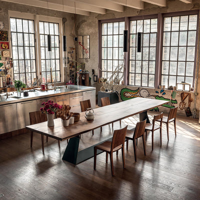 The Rialto Fly Sideboard by Riva 1920 is made from solid wood and blockboard, with a frame in either iron or matching timber. Raised on two slender iron legs, the design balances robust craftsmanship with a lighter profile. The piece features dovetail-jointed drawers and clean, handle-free doors, showcasing the brand’s attention to material detail and joinery.